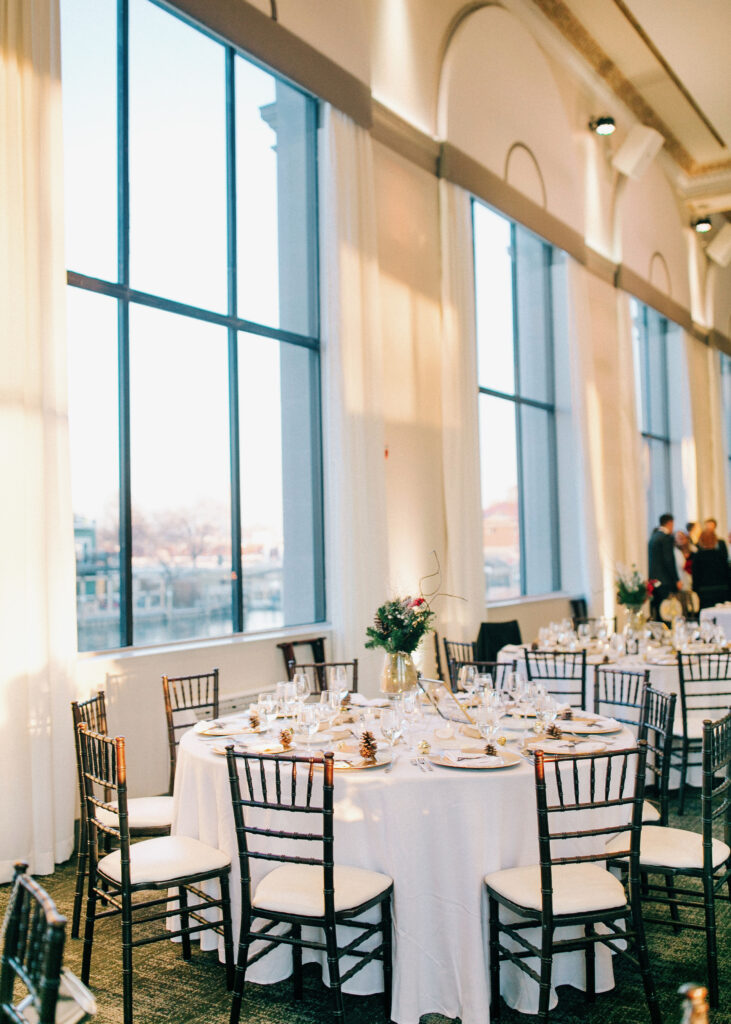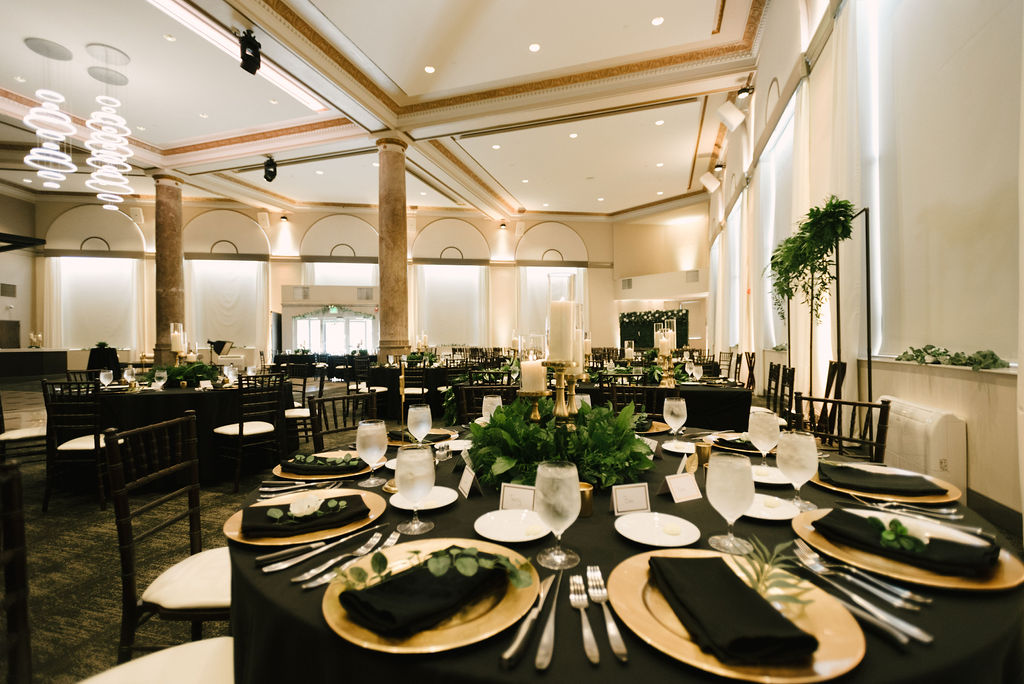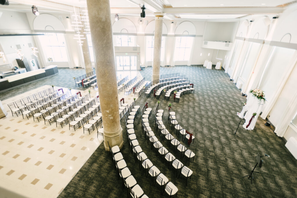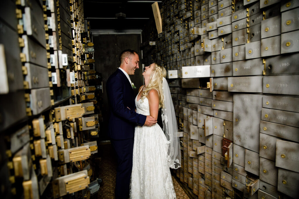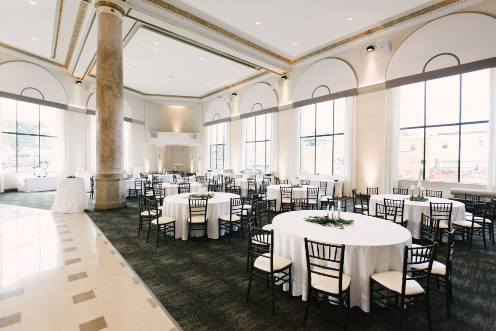 The indoor ballroom features soaring grand ceilings, dramatic 30‑foot windows that flood the space with natural light, intricate gold leaf details, and towering marble columns that create an unforgettable setting for your ceremony and reception. One of the venue’s most charming features is the original bank vault—now a striking conversation piece that adds character and history to your celebration.