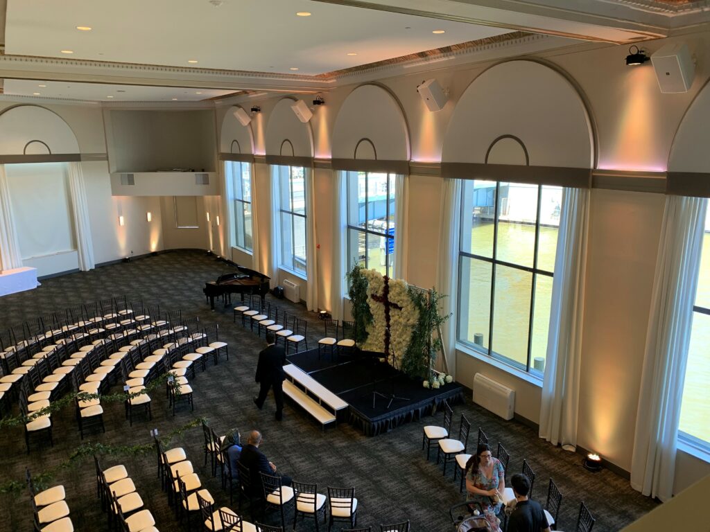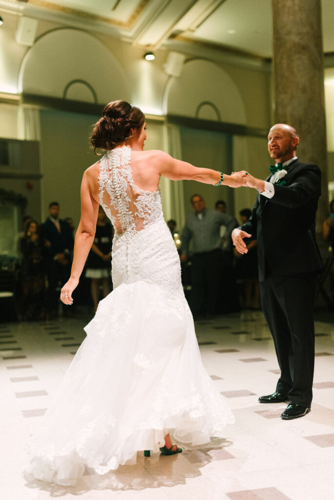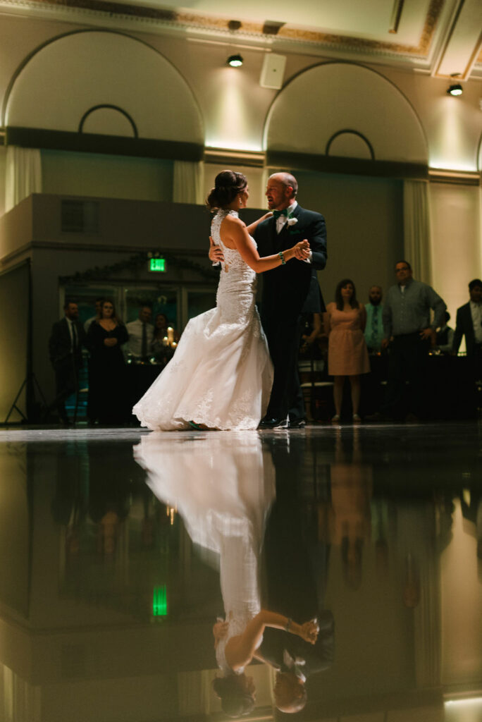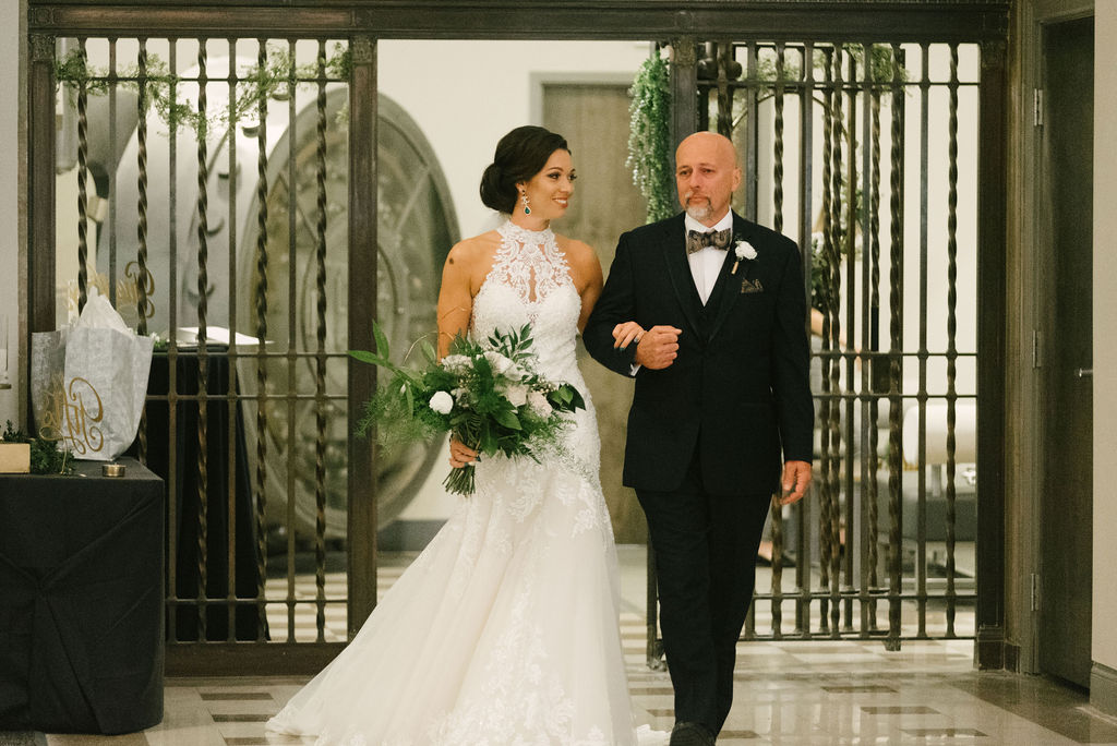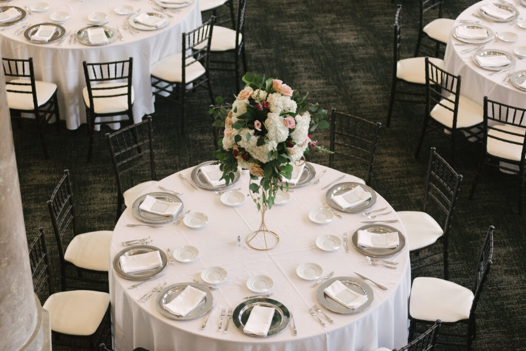 The indoor ballroom features soaring grand ceilings, dramatic 30‑foot windows that flood the space with natural light, intricate gold leaf details, and towering marble columns that create an unforgettable setting for your ceremony and reception. One of the venue’s most charming features is the original bank vault—now a striking conversation piece that adds character and history to your celebration.